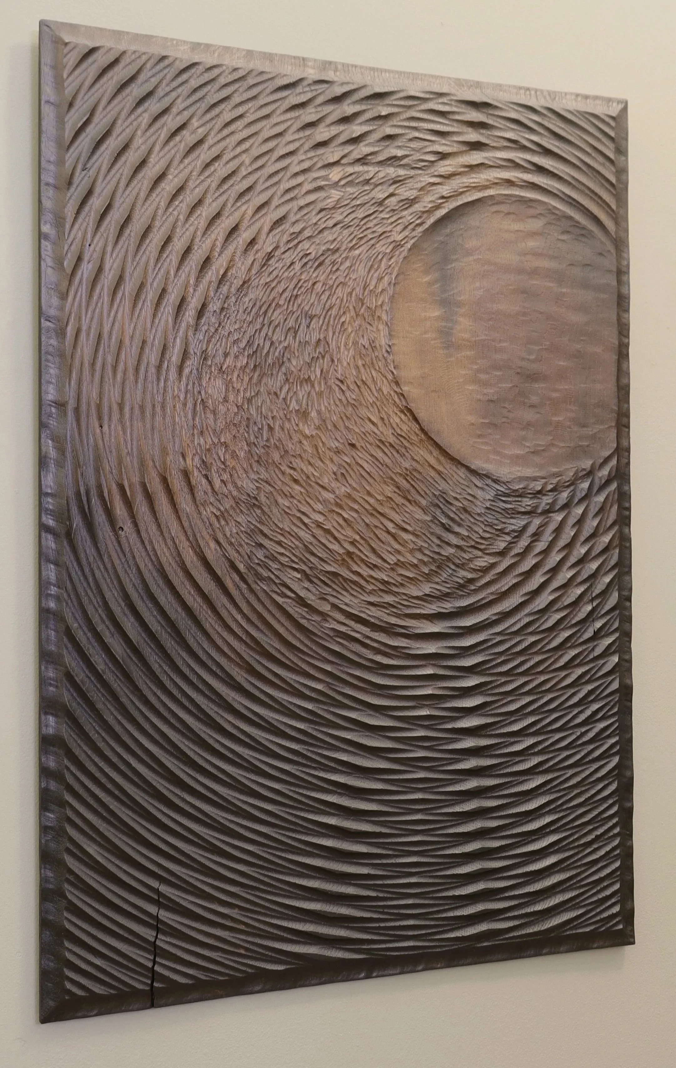 ‘Immaterial II’, James Crisp Sculptor, Carved Wood Panel in English Lacewood with Rippled Sycamore disc, 2023, 1m x 0.7m